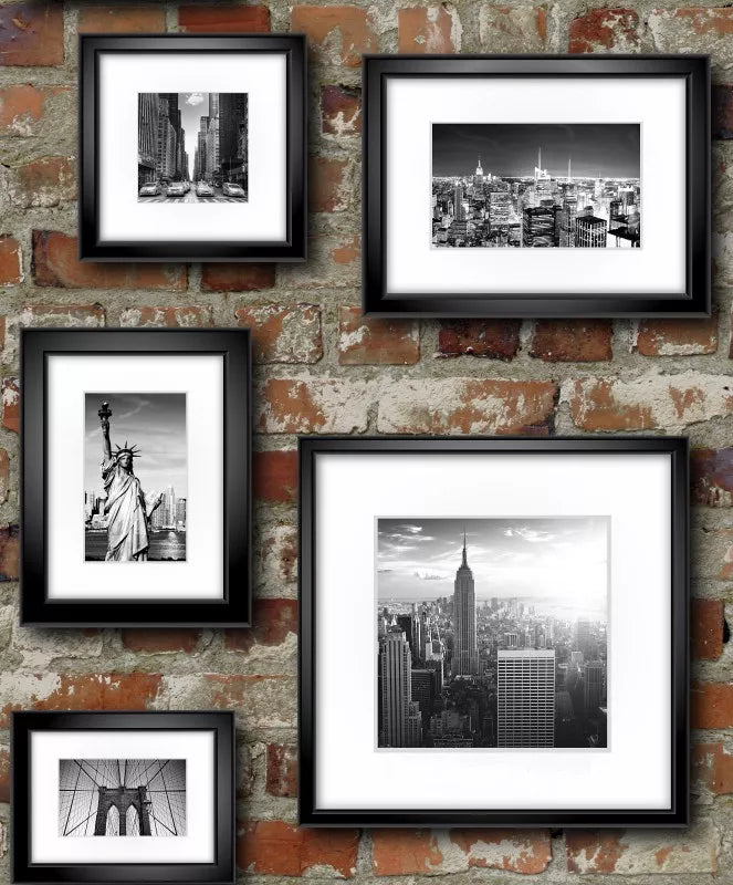 Funky red brick effect with gorgeous black and white new york frames.